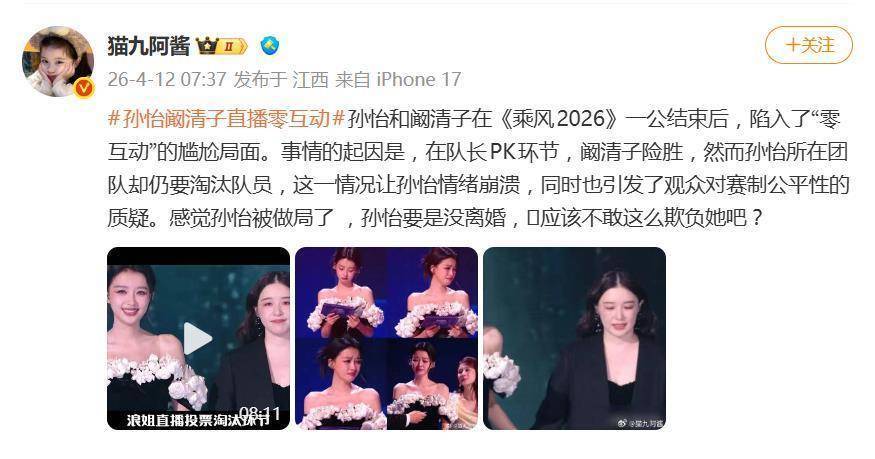 真心希望这破赛制能赶紧改改,别再让认真的姐姐们受委屈了!也盼着孙怡和阚清子能早点破冰,毕竟能在节目里遇到合得来的朋友不容易,别因为一场破比赛伤了感情。吃瓜群众都等着看你们再挽手喊“我家怡宝”呢!
